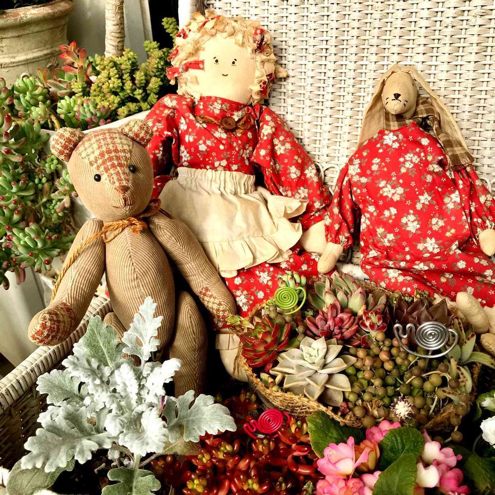 紅茶染めのカントリードールとベアのトリオ