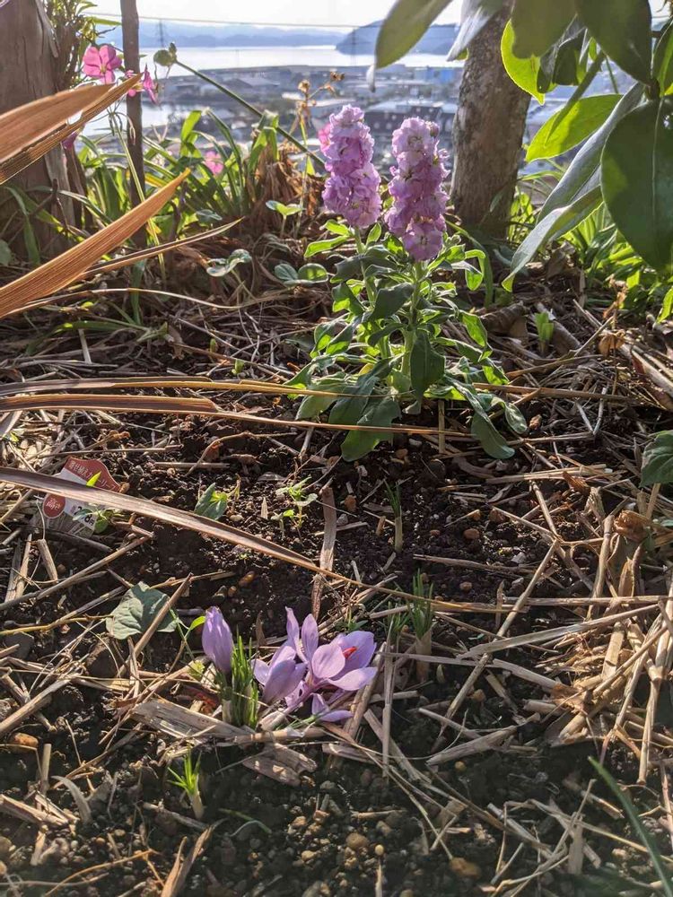 手前の花は、サフラン?ちょこんと顔だしました。忘れて足で踏んでたかもね🤭🤔😂