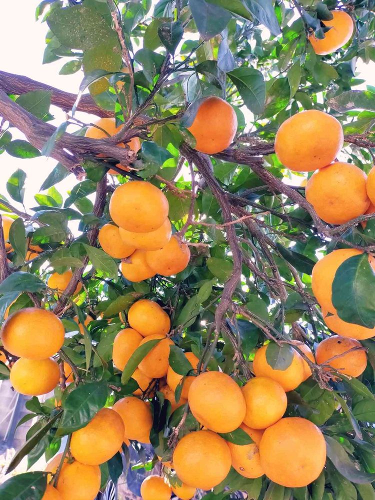 たわわという言葉がぴったりですよね。みかんの重さで、木がしなっていたので、木の内側に入って下から撮影しました😆