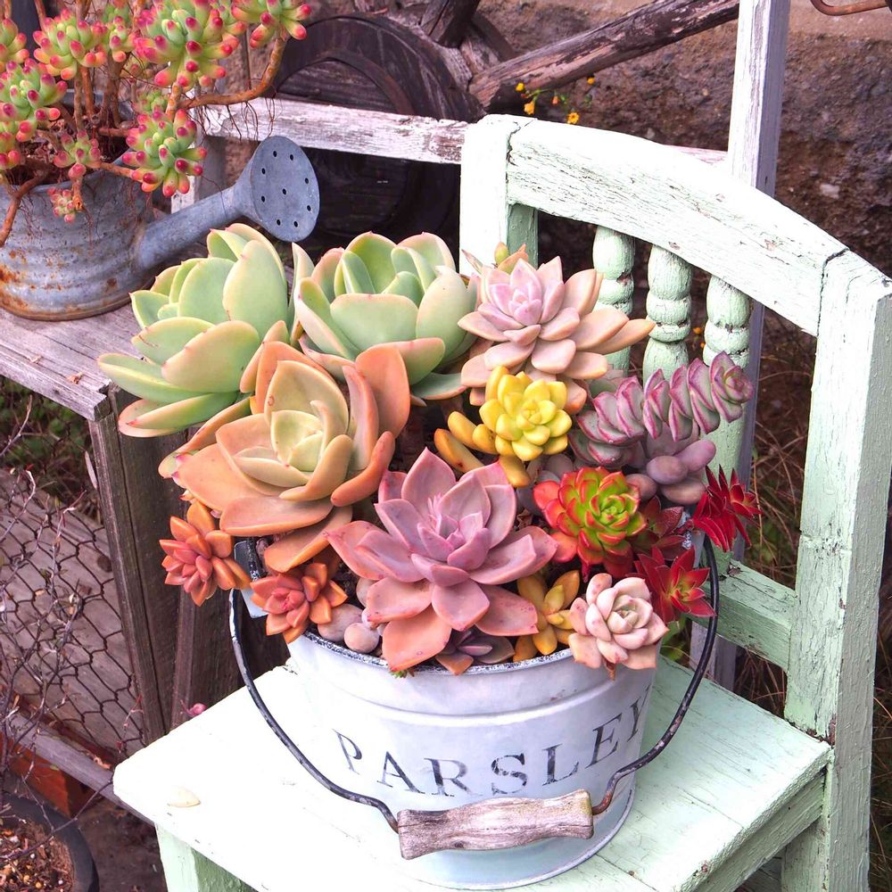 カワイイ〜、バケツの寄せ植えも後ろのジョウロの乙女心も💓