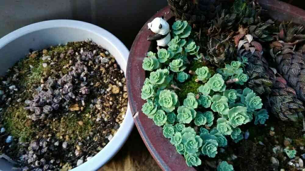 左は雨ざらし日光ガンガンのミセバヤ、右はハオルチアの九輪塔といっしょなので半日陰の外置き。