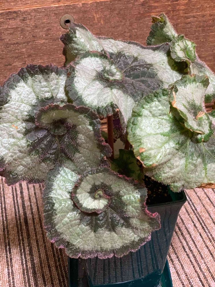 アンモナイト?にも見えるのは私だけかなぁ…🤓私はレックスベゴニア インカフレーム育ててます。部屋窓ぎわ置きで、今も元気に育ってます。古い葉から少しずつ黒く枯れてきてますが、新しい芽も🌱たくさん出てきてます。花も咲いてますよ♪