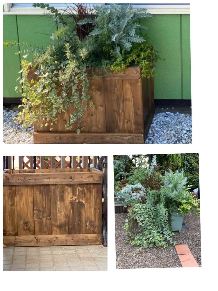 大きなコンテナボックスを作りました。グリーン主体の植物を寄せ植えした大型のコンテナをスッポリ入れて、ディスプレイしています。