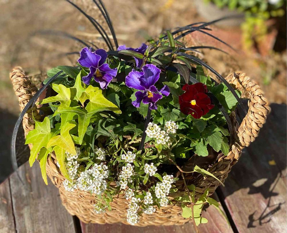 カゴはお菓子が入っていた物で、土を入れる前にクリアペンキのスプレーを吹きつけて傷みにくいようにしました♪