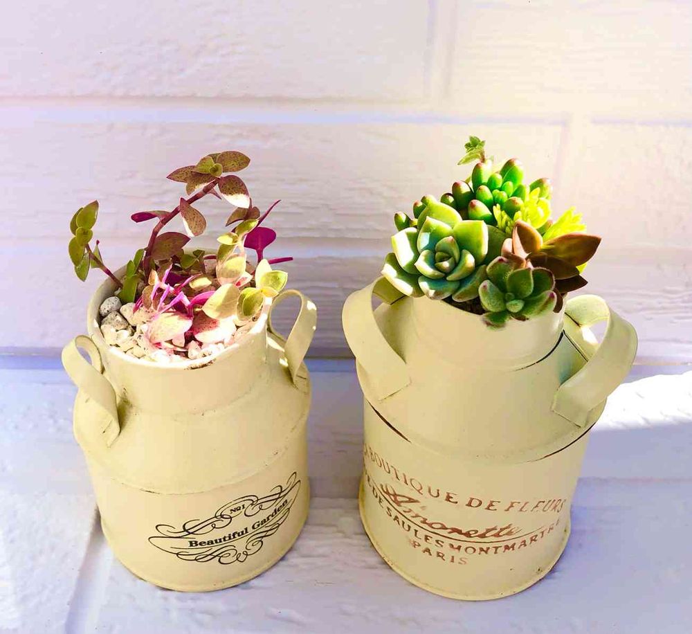 100均のミルク缶?みたいのにカリシアロザートとカット苗を寄せました💕