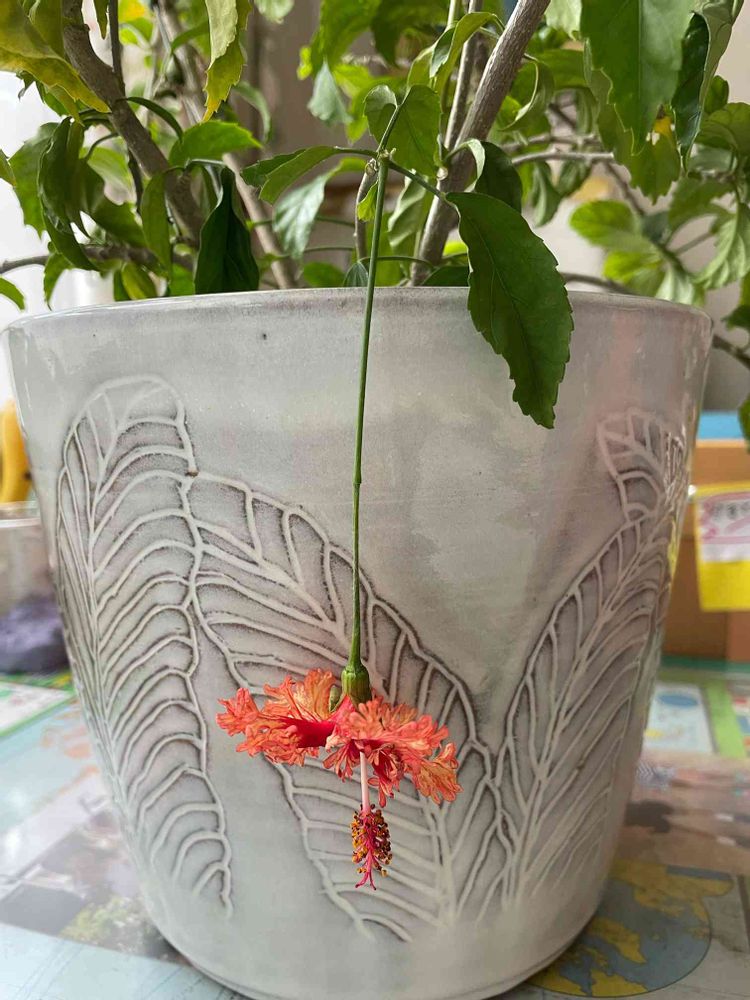 キッチンに入れていたハイビスカス 風鈴仏桑華の花が植木鉢カバー裏で咲いてました。