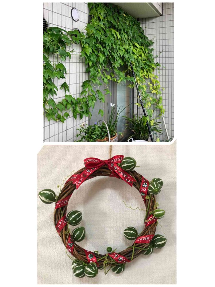 種から育てた沖縄スズメウリ。ベランダで蔓延ってます。まだ緑の実ばかりですが、リースを作って友人に送りました。