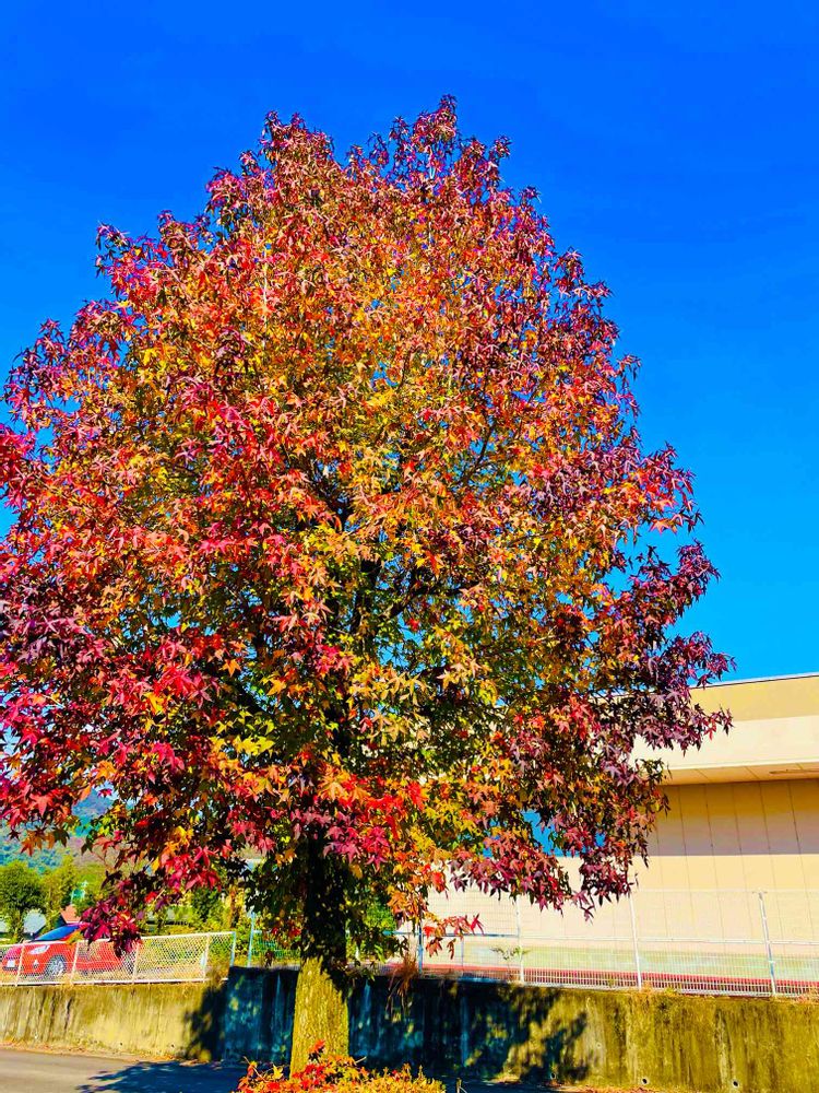 いつも行く大型ショッピングセンター駐車場の木が美しく紅葉、青空に映えていました🍁🍁🍁