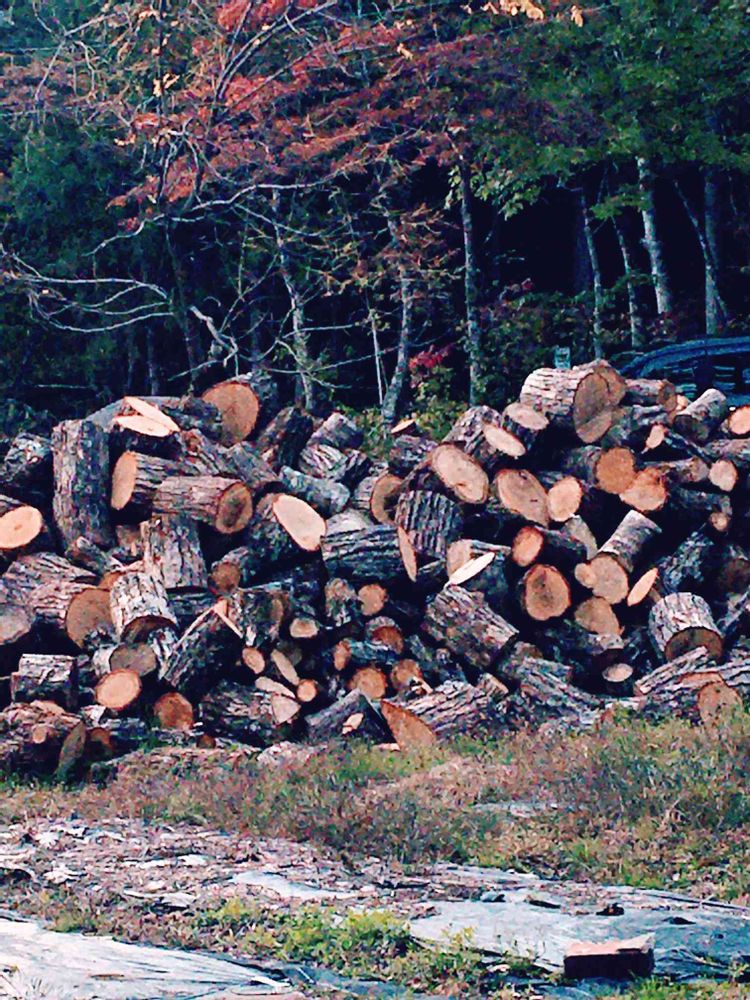 近くのカフェに薪割りしたのが積まれてた〜〜
