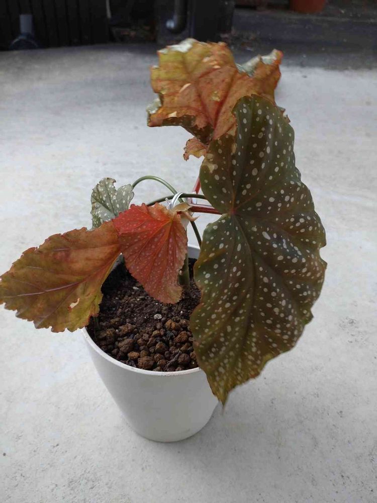 深緑色の葉に白い細かい斑入りで新しい葉は赤茶色です🍂