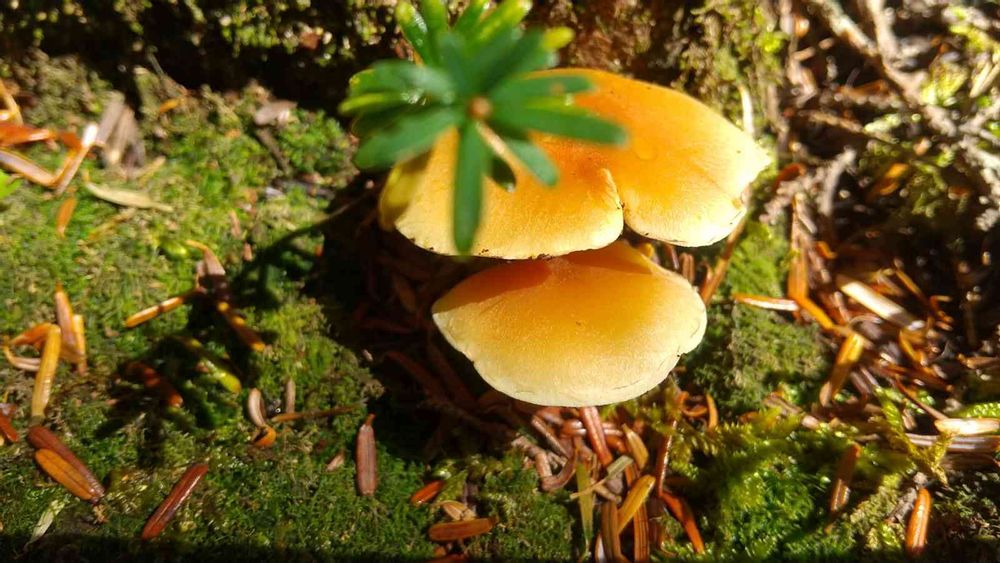 撮影の時には気が付かなかったのですが、何かの若芽が、まるでキノコの髪飾りみたいでオチャメです。コメツガの若い芽かな。何のキノコかな?