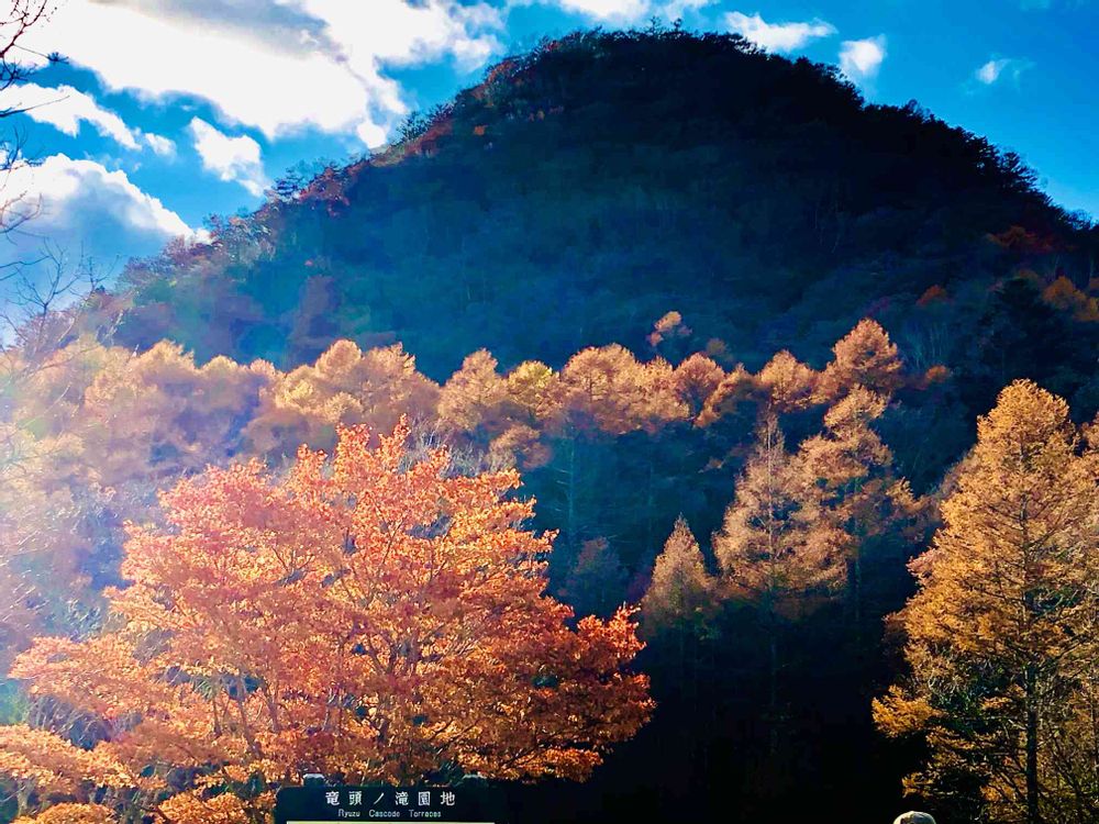 11月5日、奥日光「龍頭の滝」滝上の、山⛰に映し出される「カラマツ林の金屏風」を狙って見ました❗️