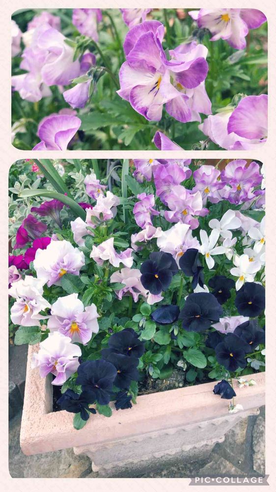 フリル咲きのパンジーとウサギ耳ビオラ、ブラックビオラの寄せ植え🪴 ペチュニア、シルバーリーフなど、いろいろ入れちゃってます
