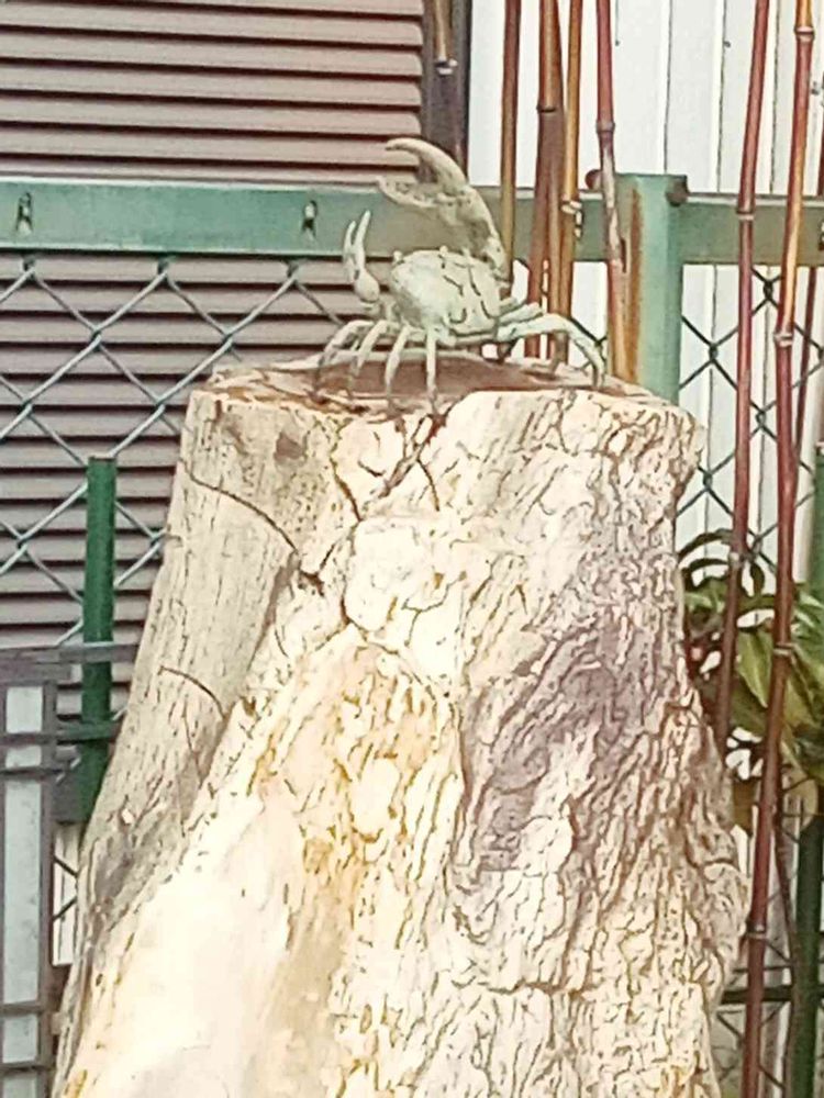 昨日、買い物途中で、通り道のお宅で、切り株に🦀の置物が、ありました。
