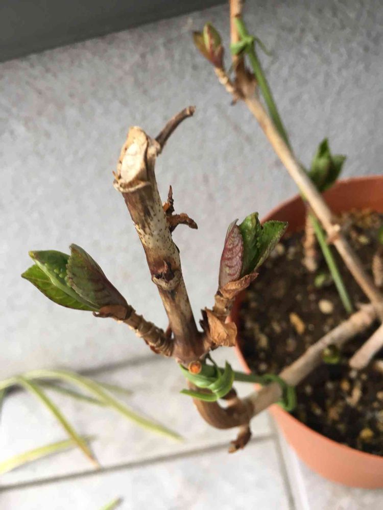 昨年の母の日に、息子から貰った紫陽花‼︎ 冬枯れてもう捨てよと思ってたら、なんと芽が、出てました🌱✨ 肥料もあげてないのに、、凄い生命力🌿
