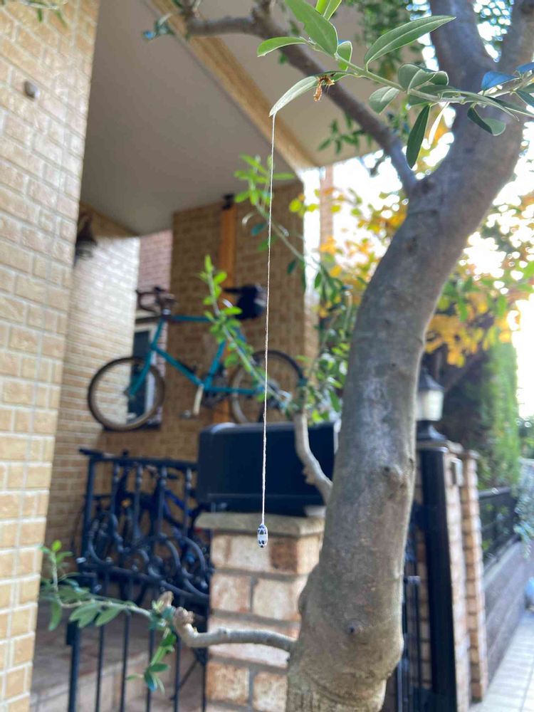 オリーブの葉裏から蜘蛛の糸のような物が15cmくらいあり、その先に楕円形の卵のような物があります。