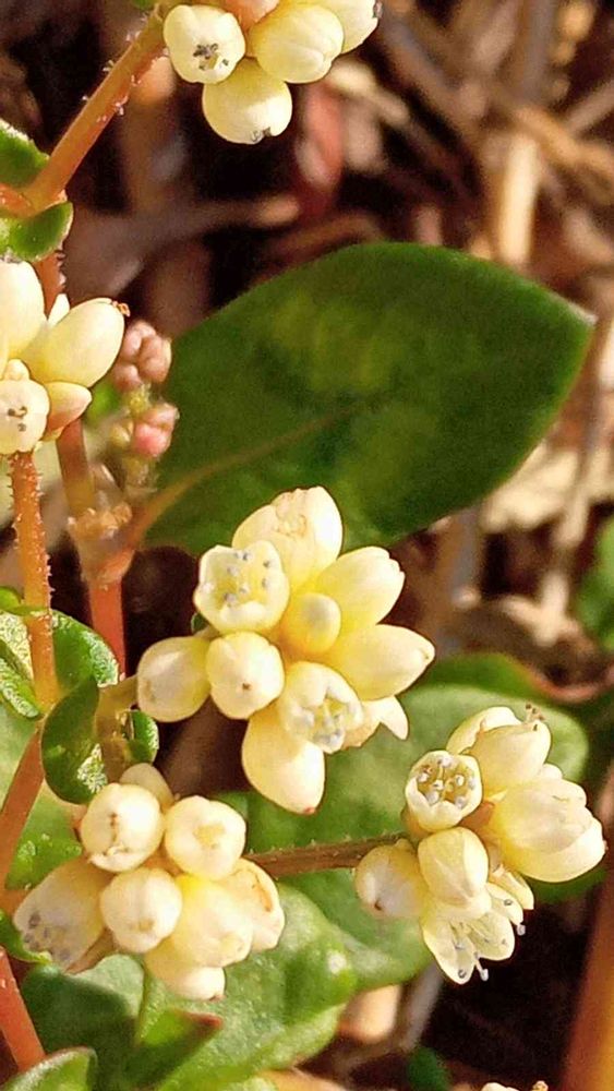 ツルソバの花 少し足を伸ばした先に今日の出遭いの花が 小さな白い花が目に止まりました。ミゾソバの花ににていますがポリゴナム(ヒメツルソバ)のような丸葉です。🤔🔎👀🔍さっそくググって見るとツルソバがヒットしました。🤗