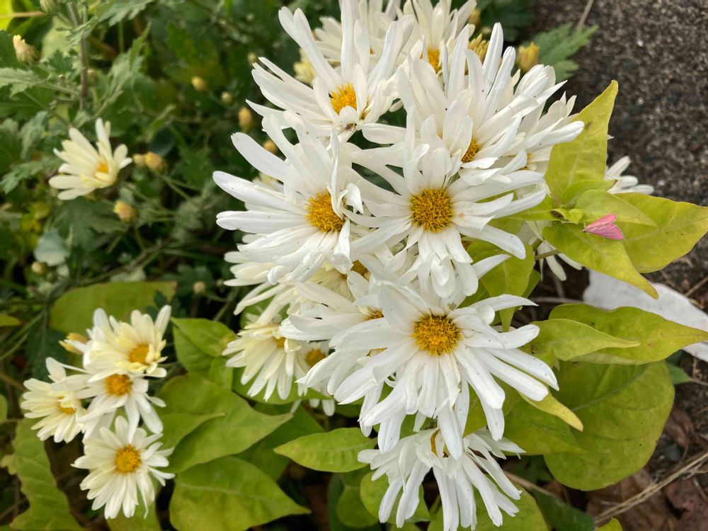 ワンコ散歩途中で可愛いお花 花は菊の様でも葉が違う マーガレット?ディジー?名前がわかりません💦