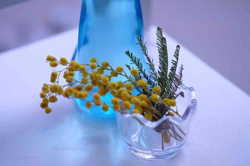 青いガラス瓶でミモザの黄色が、映えますね💙💛