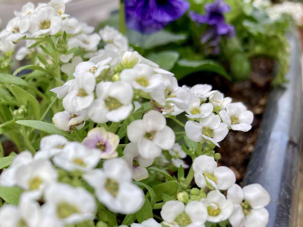寄せ植えに使っている100円以下の苗ですが…何故か白色の中に一輪だけ色がついています😄