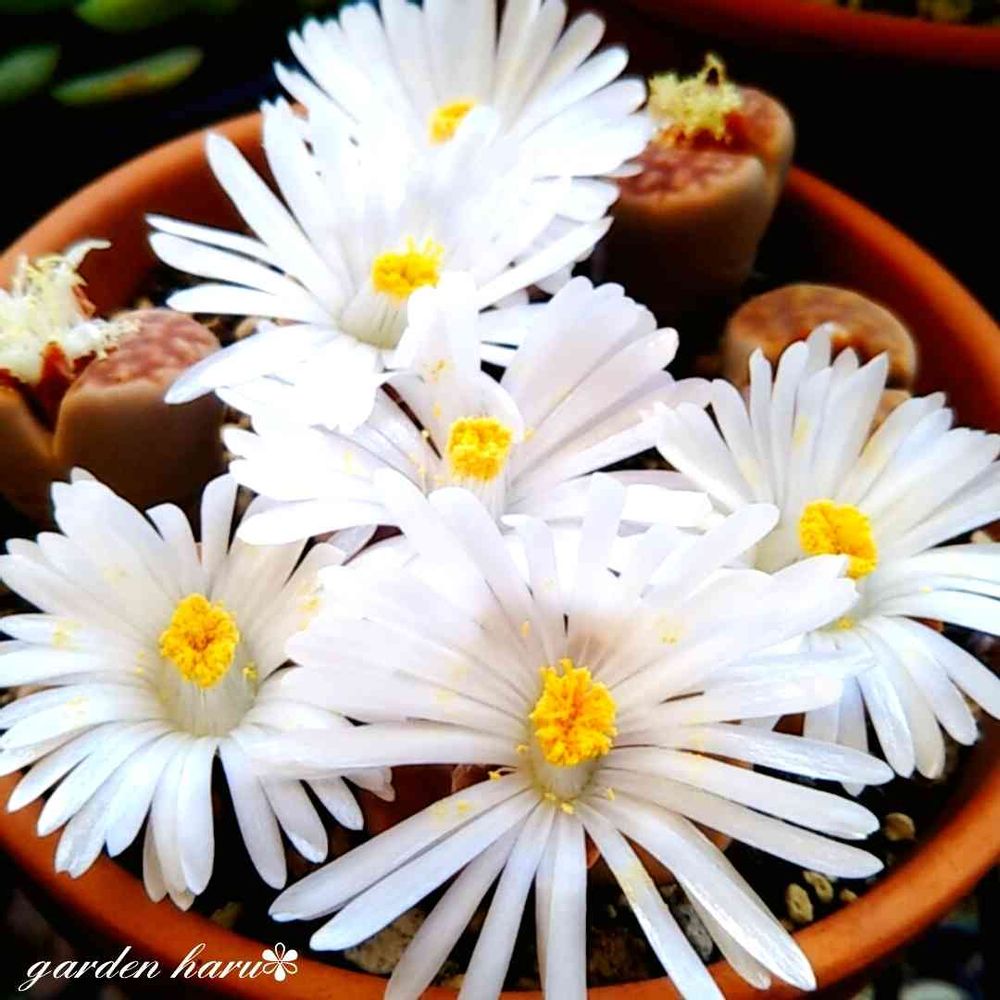 昨日まで茶色一色だったリトープスが、一気に咲いて真っ白ー!!