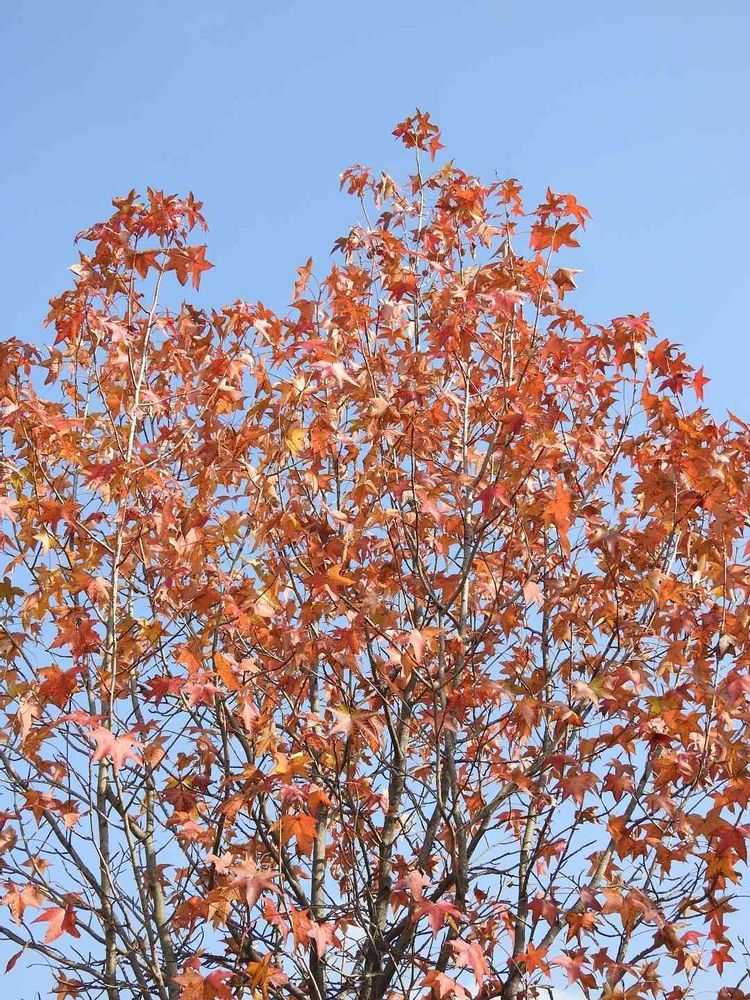 青空に映える綺麗に紅葉した🍂モミジバフウ🍂