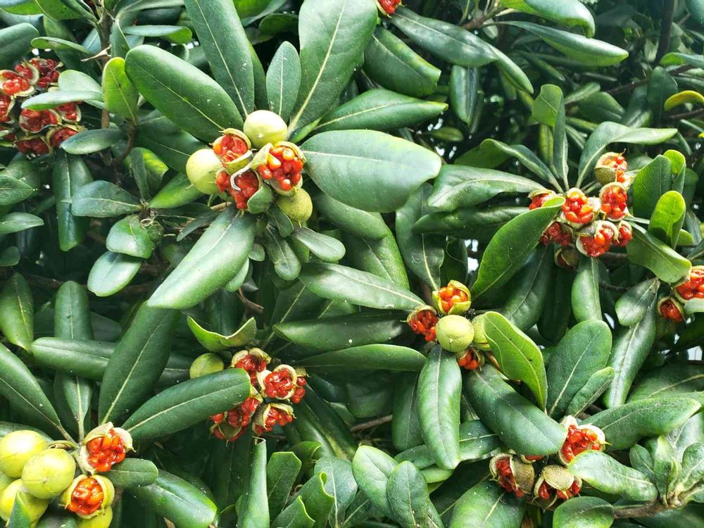トベラの実の中には粘着質の赤い種子が詰まっていて、無味無臭で美味しくないそう。こんなに真っ赤で熟しているように見えるけど👀