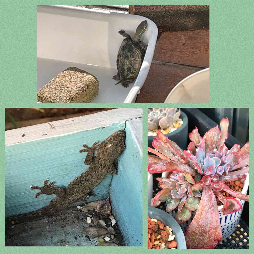 左下📷 木箱を掃除しようと、鉢を持ち上げた途端に大騒ぎで、私の心臓が止まるかと驚いたヤモリ🦎さん😆