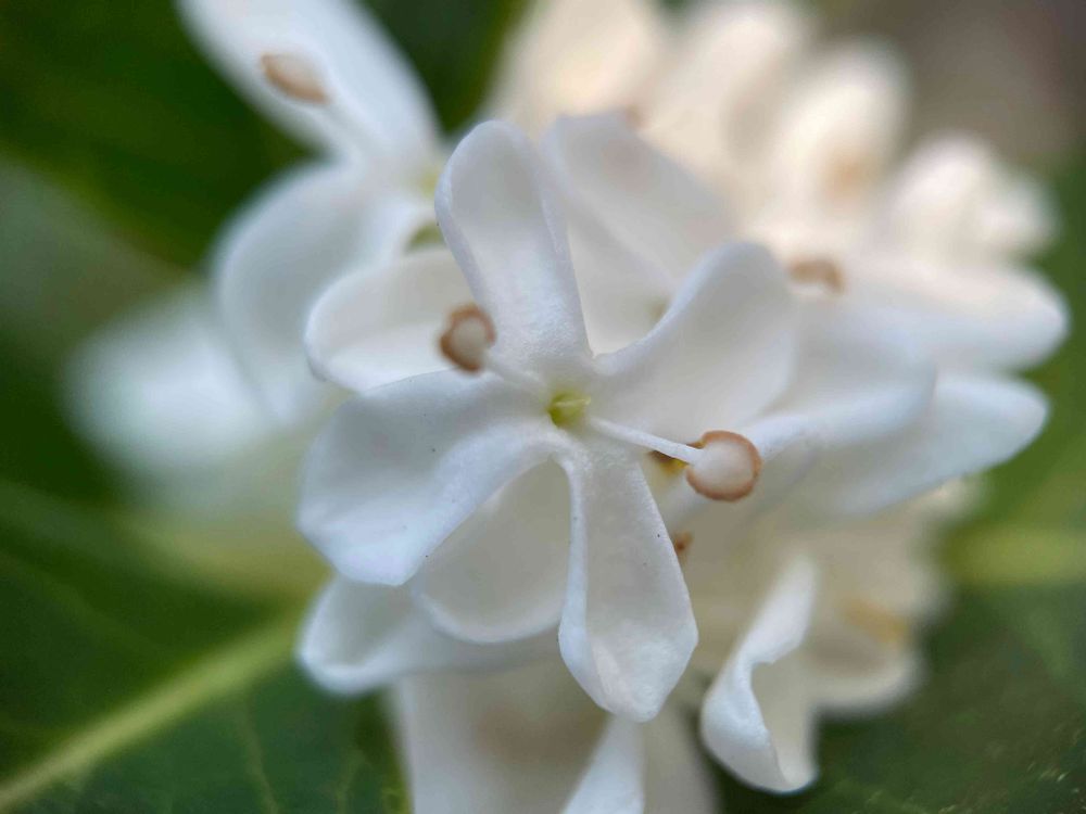 香りは金木犀ですが、拡大するとこちらの方が柔らかな気がします。銀木犀の花は何となく陶器みたいに硬質なツルっとした感じでした。
