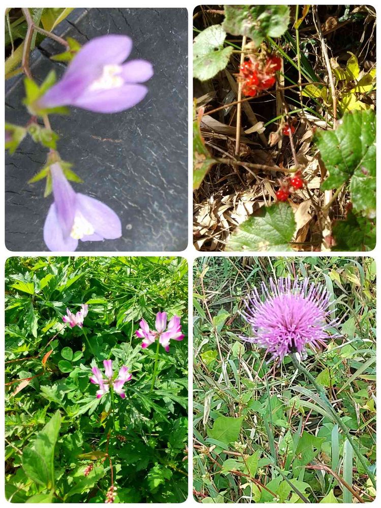 こんにちは😁今日、畑の奥の溜め池に行って来ました。山の中腹にあるので、山野草があるのではと期待して行きました。池に行く前に、田んぼの側で、アザミとレンゲを見つけました。狂い咲きでしようが、可愛いかったのでー🌸左上、ムラサキサギゴケ 右上、冬イチゴ🍓