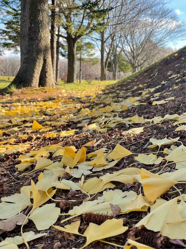 蝦夷リスさん達の食べカスの上にイチョウの葉が落ちて…🍂