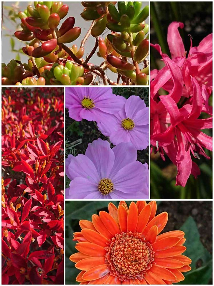 時計回りに、ニジノタマ、ネリネ、ガーベラ、ドーダンツツジ、コスモスです。