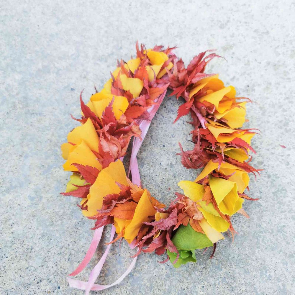 イチョウとモミジを1枚1枚拾ってペーパーラフィアで編んでます🎵