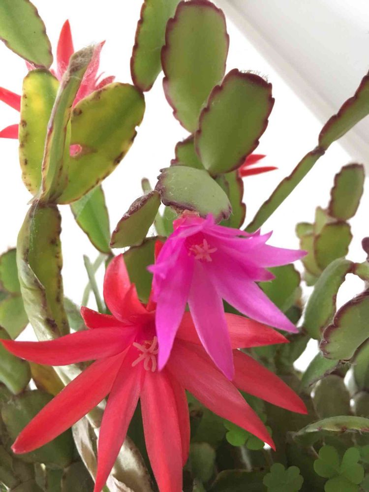 シャコバサボテンに限りなく近い仲間だとは思うのですが、お花の咲く時期が違うので、お花屋さんにもこれからの時期でまわります(昔は…笑笑)シャコバサボテンよりしっかりしたお花で、かわいいです😍😍