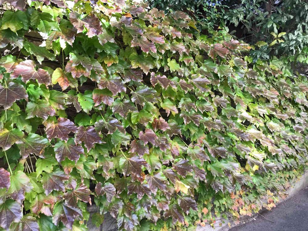 お店を閉めてしまったお菓子屋さんの塀に繁る蔦、掌を差し出すよう。皆がみなうまく重ならないように陽を浴びてます。