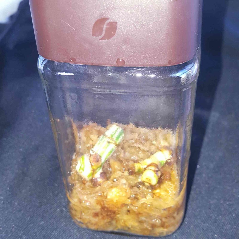 無菌培養の培地は寒天を使うみたいだけど今回はハイ ター&熱湯消毒した水苔培地に熱湯消毒したルートン、メネデール、ハイポネックス、苗は薄めたハイターで消毒