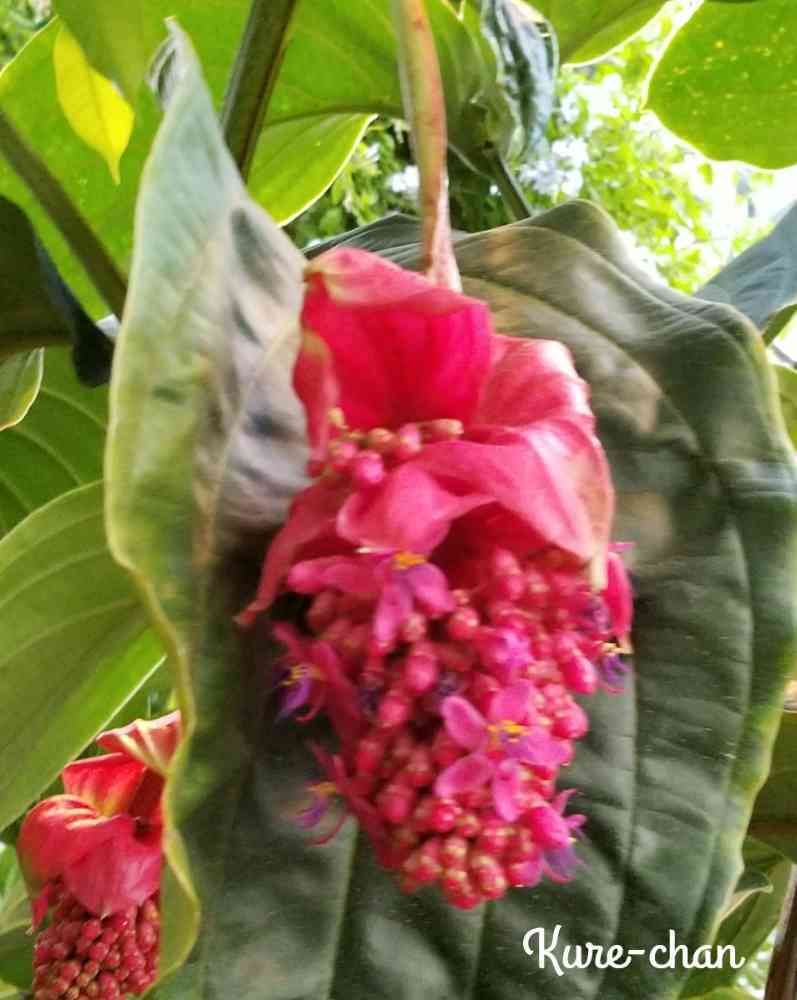 特徴のある葉に、 ピンクの垂れ下がった房咲きの大きな花