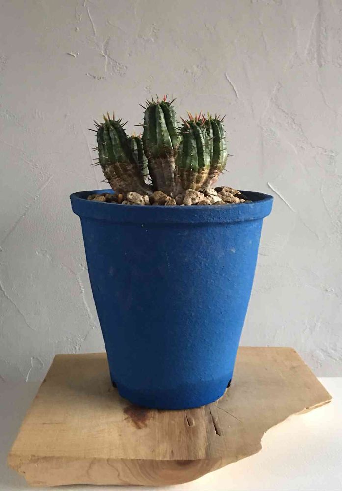 木質化してきている風合いが際立つ、鮮やかな青の器に植え替え完了ヽ(´▽`)/
