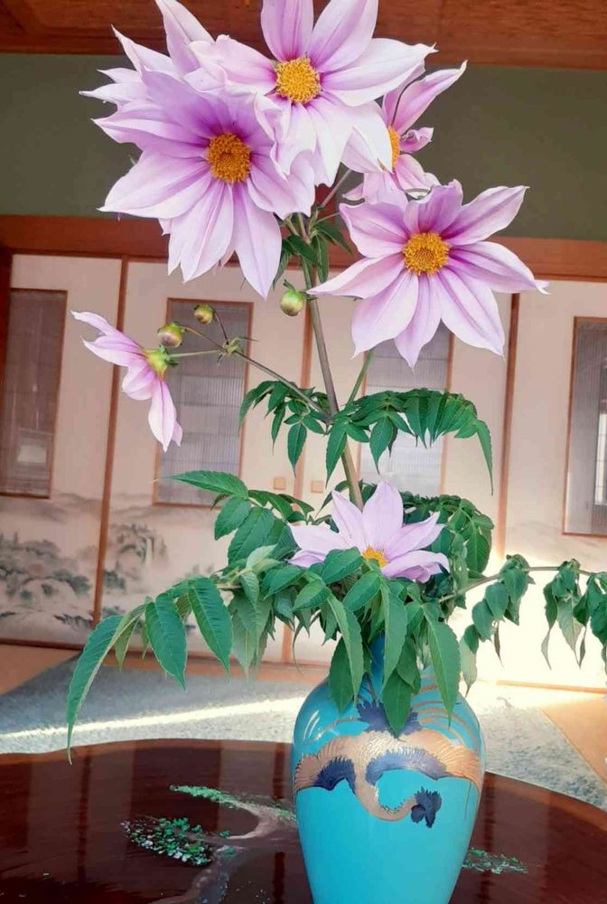 今が旬のお花、皇帝ダリアをこのように生けていらっしゃるのを見たのは、初めてです💖