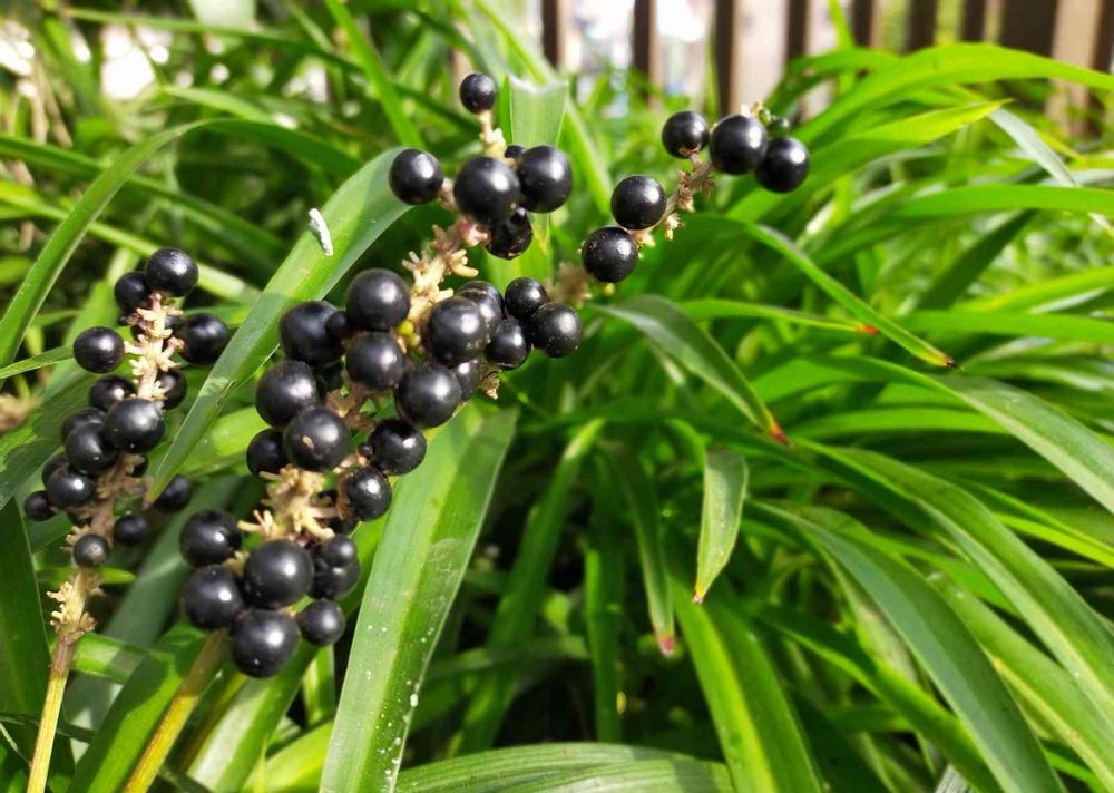 黒く直径6〜7mmの果実のように見えてるのは じつは 種子なんです。ヤブラン属の果実は果皮が薄くて早い段階で脱落し、種子がむきだしになって成熟するそうです。