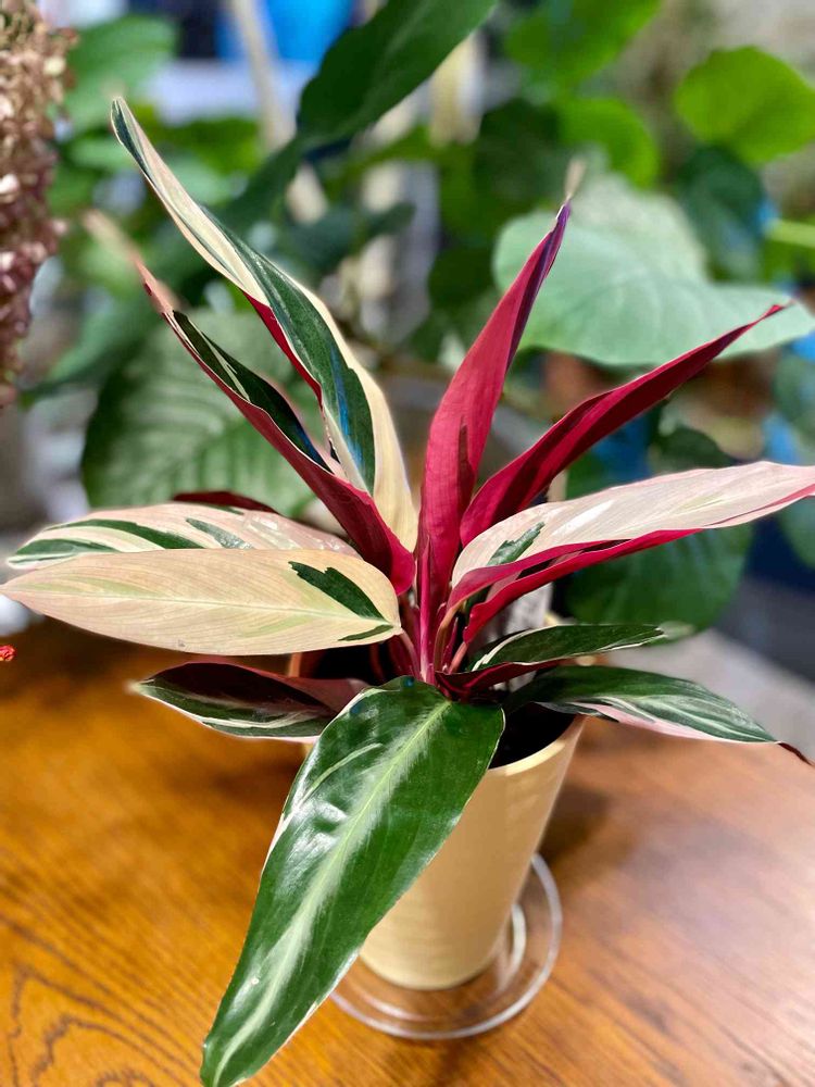 ストロマンテ•トリオスターって名前らしい☺️白い斑が入った葉っぱで🪴葉っぱの裏側が赤くなてる。これがアクセントになってる感じ🤔大きくしたら、さらにインパクトがあるかも。さぁ〜大きく育てるぞ😤