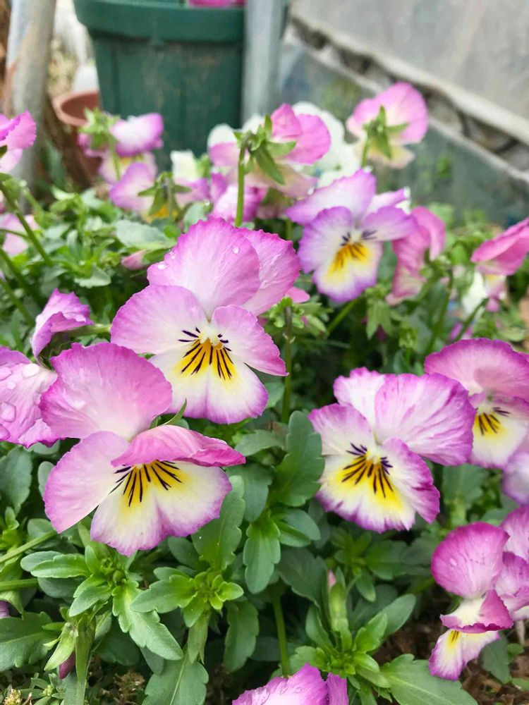 畑の入り口の花壇に植えたパンジーとビオラがモリモリしてきました🎶