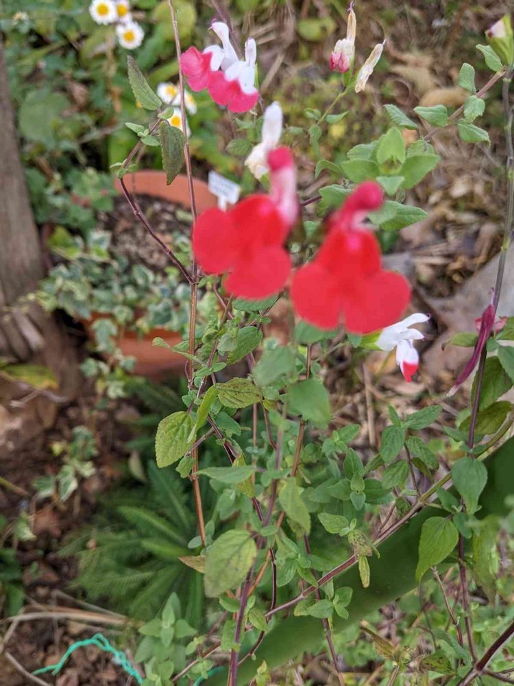 チェリーセージ白と赤の紅白。お正月まで、咲いてくれたら、華やかなんだけど、そうもいかないところが、花模様😅💐🤣🤔