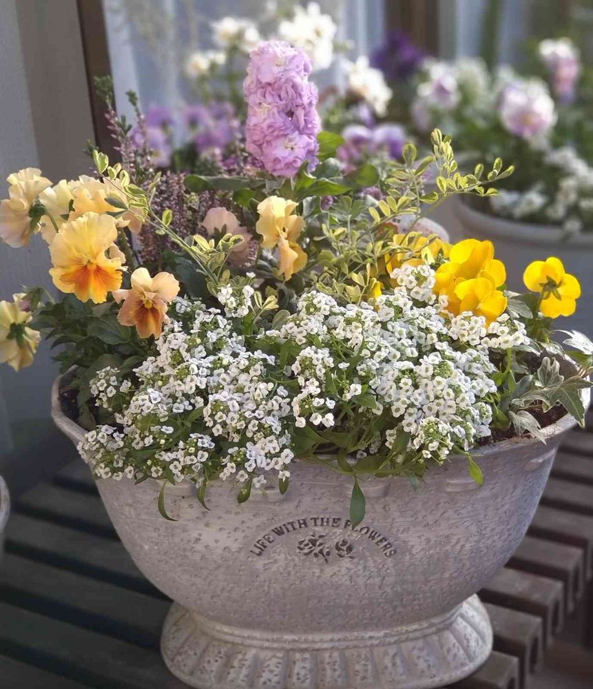黄色のパンジー、ビオラとアリッサムの寄せ植えです💛🌼💛🌼