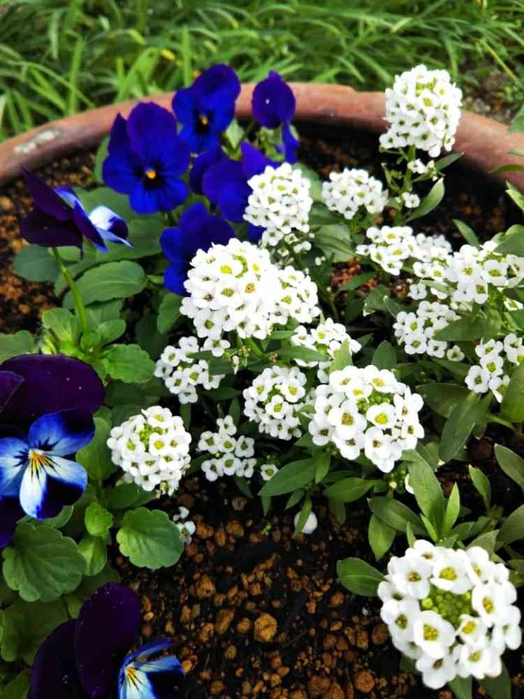 紫のビオラとPWスーパーアリッサムが成長してきました。
