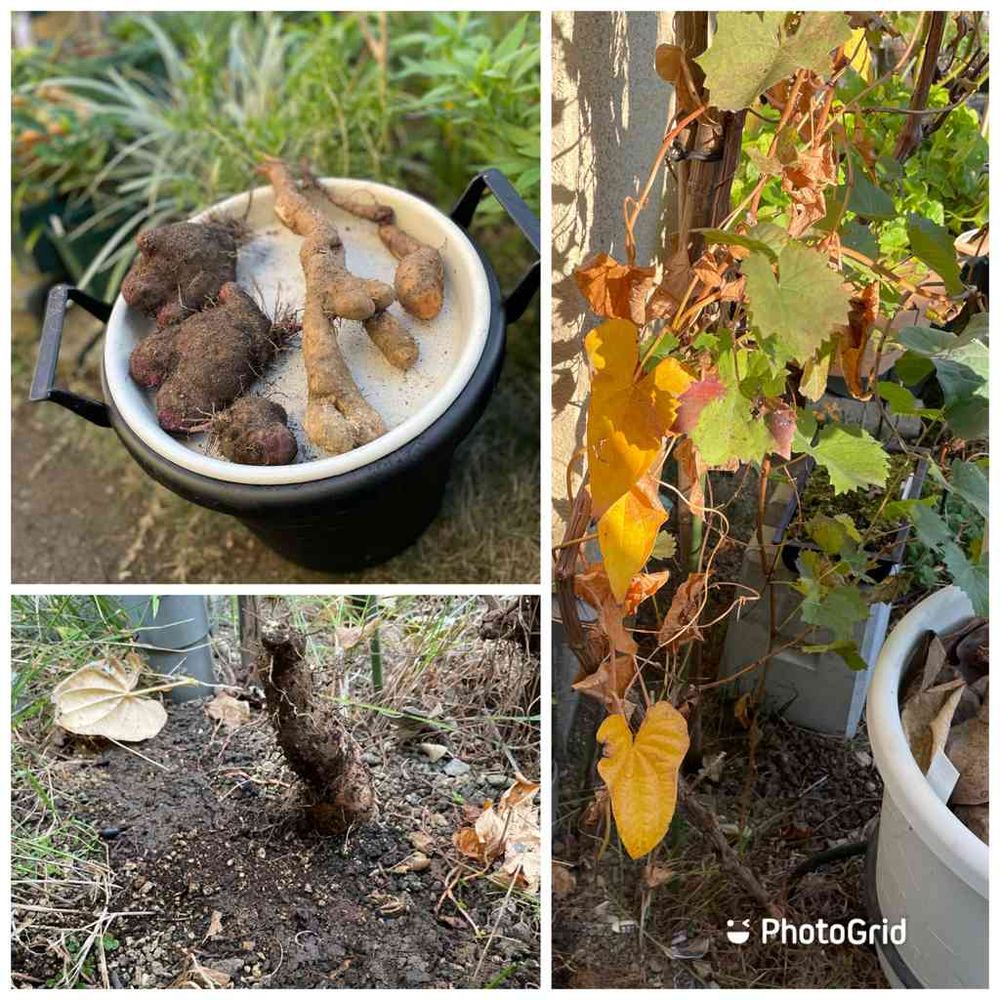 肥料袋で育てたヤマイモが底を破って、地中に伸びていました。葉も色づき、ツクネイモと共に収穫😄