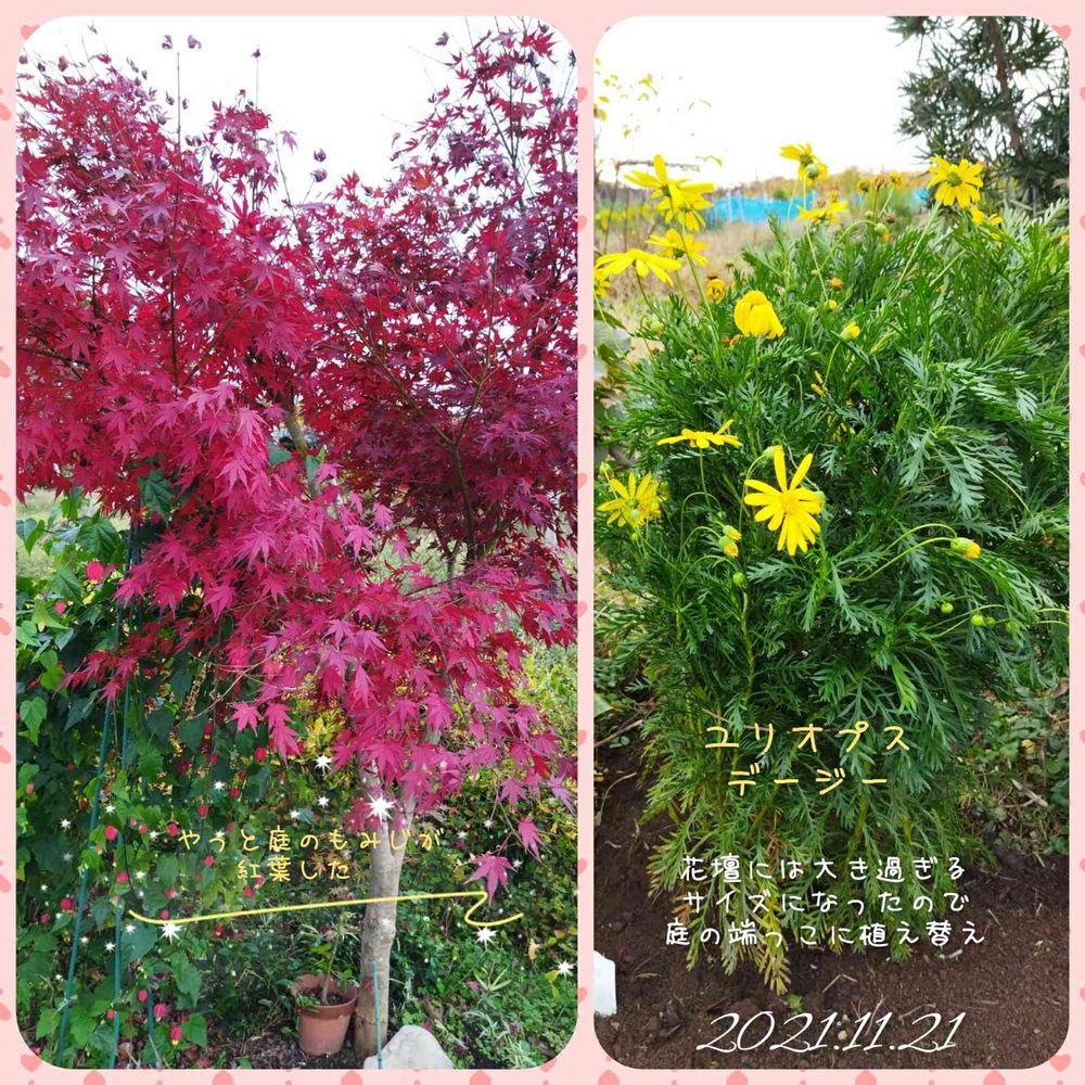 ユリオプスデージーが大株になり花壇では大きすぎるので庭の端っこに植え替えました〜。