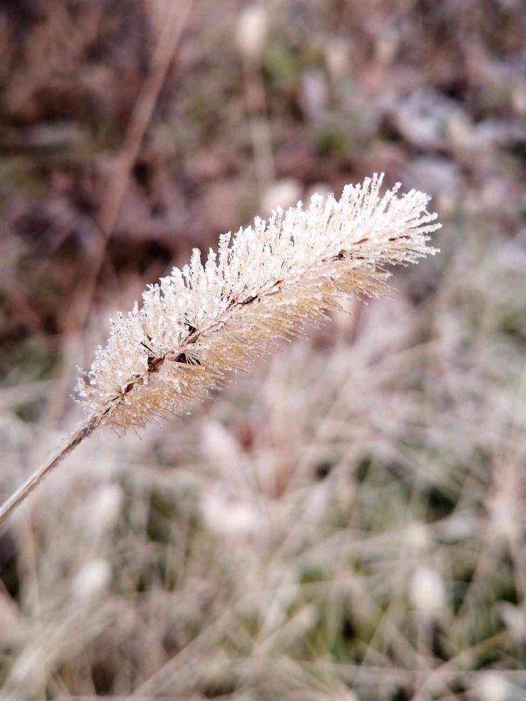 霜でコチコチのネコジャラカシ、今朝は初氷でした