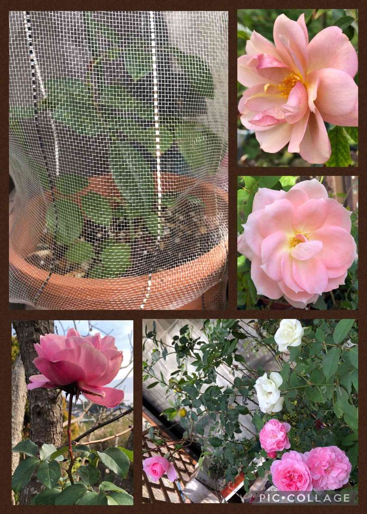 ↖️は剪定枝を水に浸けといたら根が出ていたので、鉢上げしたもの…防虫ネットでくるんでみたら、綺麗な葉が沢山着いてます😃🌿