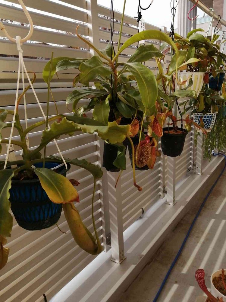 部屋からベランダにだしたネペンテスたちの日光浴です。